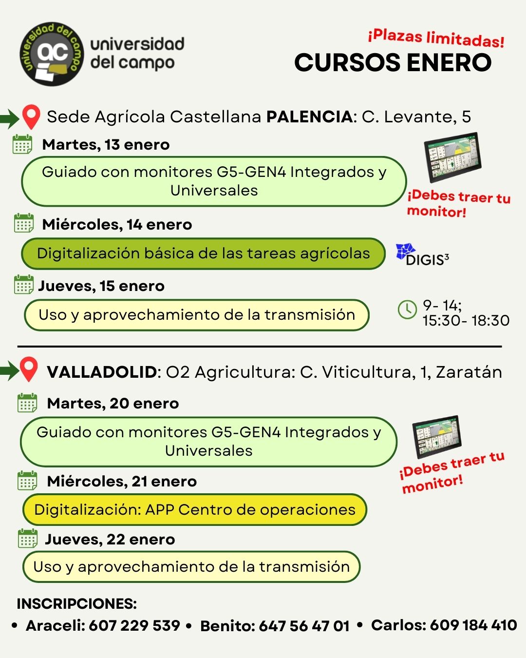 Han sido muchos los clientes los que se han acercado en busca de información, asesoramiento a la hora de adquirir nueva maquinaria y aplicar las nuevas tecnologías a sus explotaciones. Por ello, con nuestros cursos abriremos la puerta a las demandas de formación que tienen nuestros clientes en distintas áreas, desde un punto de vista práctico y con el objetivo de aprender a manejar los equipos y sus funcionalidades para ser lo más productivos posible.