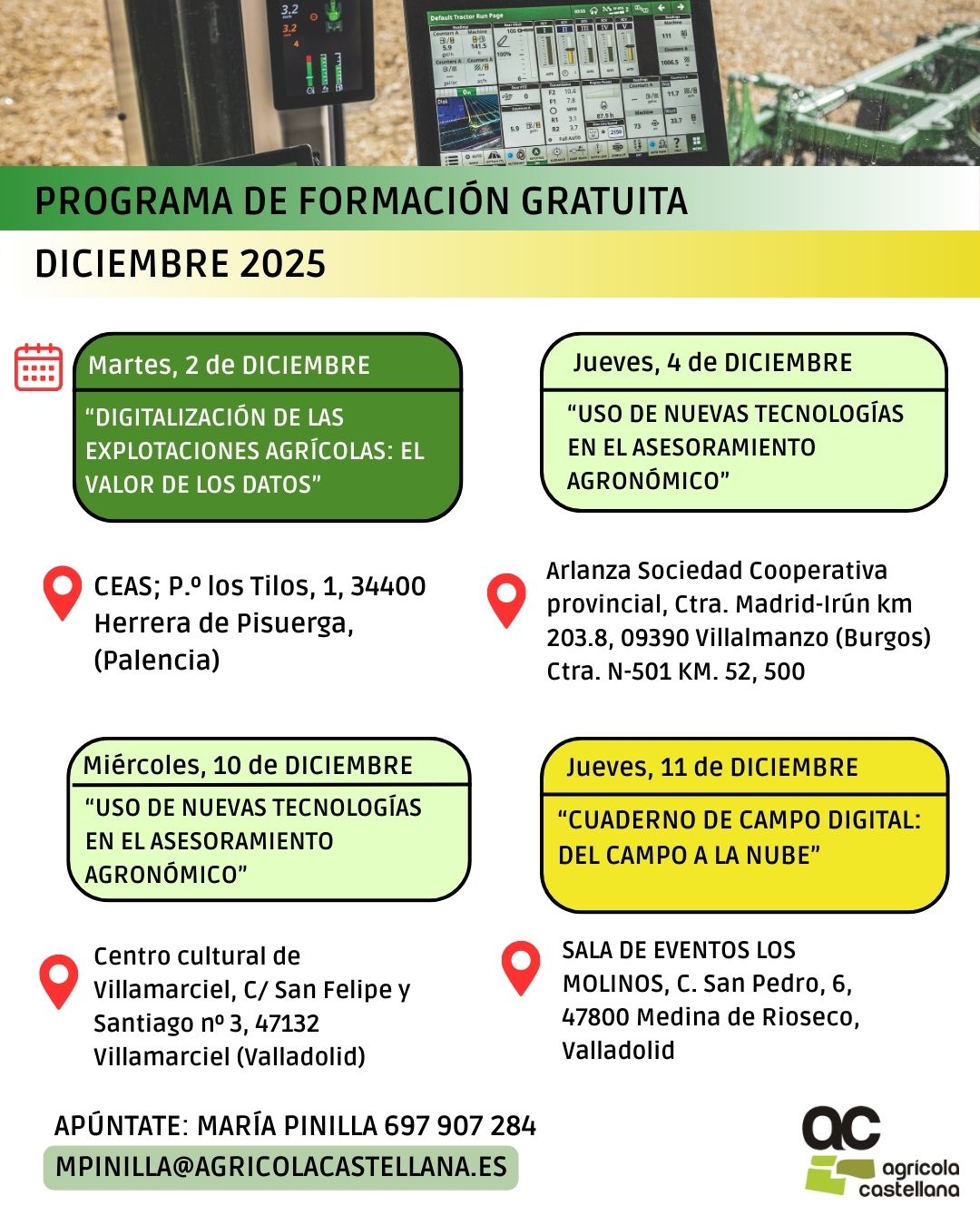 AGRÍCOLA CASTELLANA enmarca la UNIVERSIDAD DEL CAMPO dentro de su filosofía de asesoramiento y servicio hacia sus clientes. Aspiramos a ser la ventana que abra la tecnología a nuestros agricultores y ganaderos.
