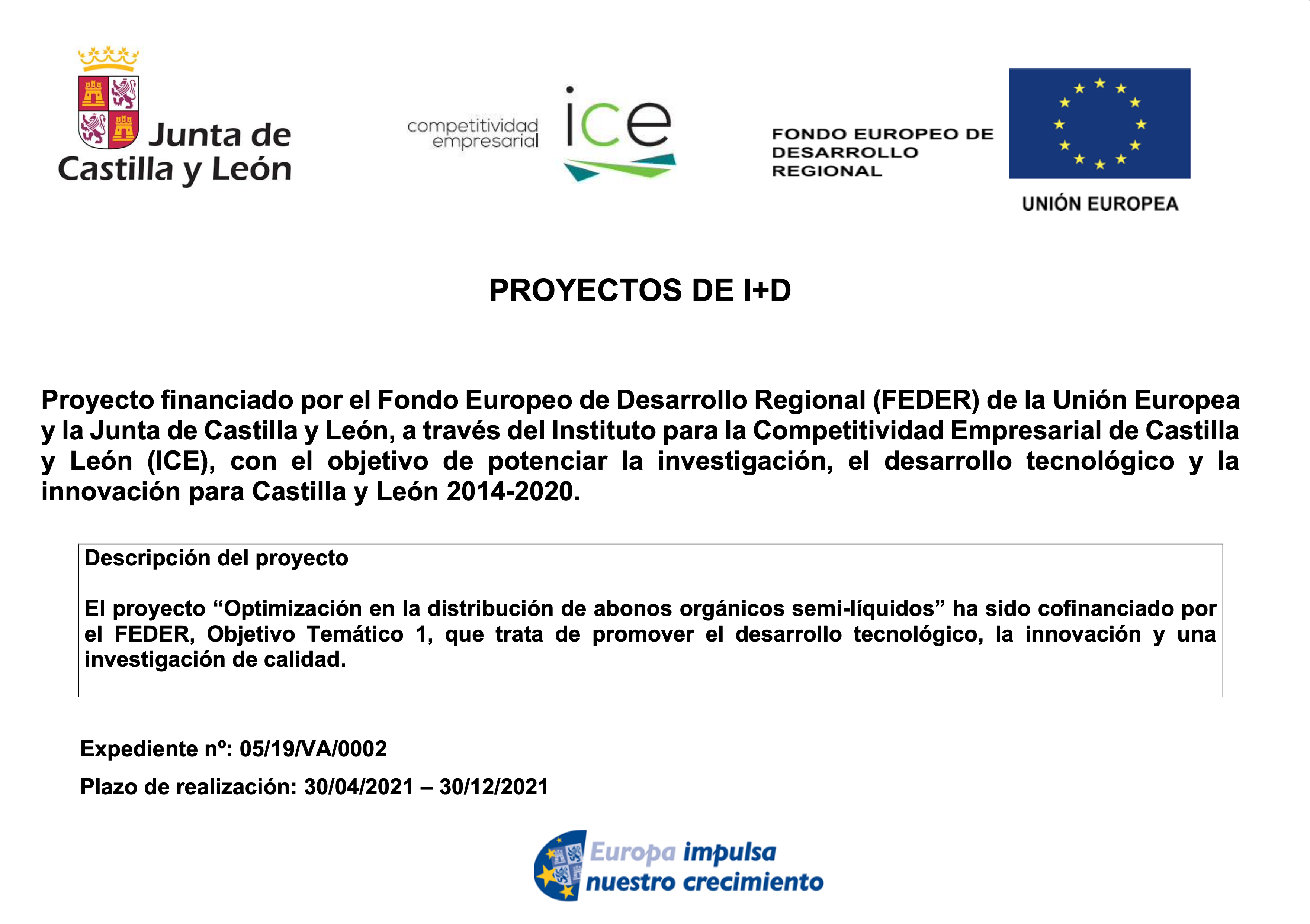Optimización en la distribución de abonos orgánicos semi-líquidos» ha sido cofinanciado por el FEDER, Objetivo Temático 1, que trata de promover el desarrollo tecnológico, la innovación y una investigación de calidad