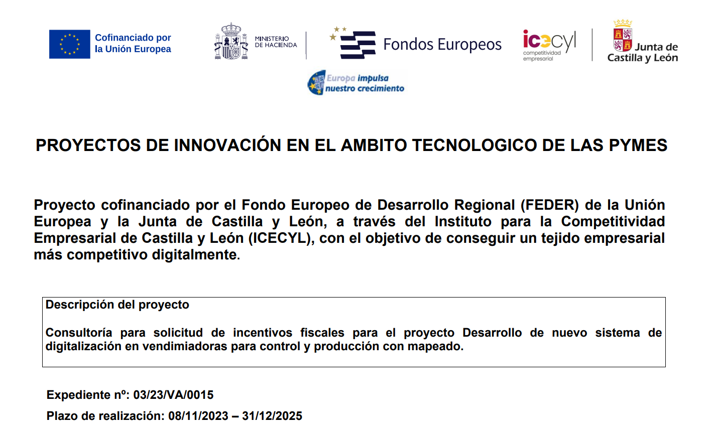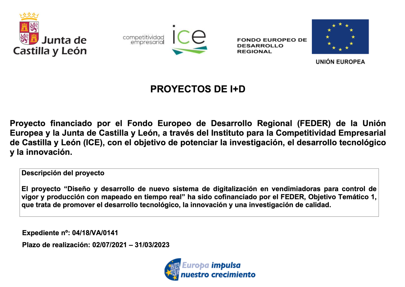 Diseño y desarrollo de nuevo sistema de digitalización en vendimiadoras para control de vigor y producción con mapeado en tiempo real’ ha sido cofinanciado por el FEDER, Objetivo Temático 1, que trata de promover el desarrollo tecnológico, la innovación y una investigación de calidad