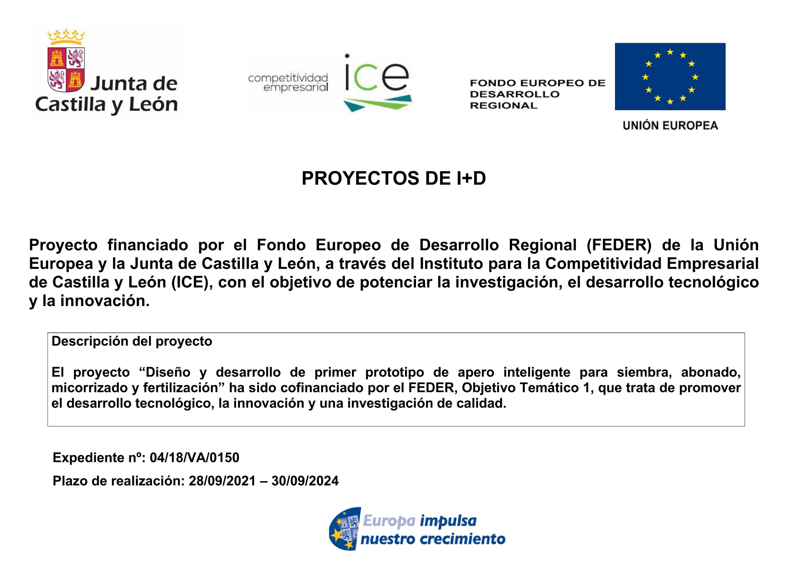 Diseño y desarrollo del primer prototipo de apero inteligente para siembra, abonado, micorrizado y fertilización» ha sido cofinanciado por el FEDER, Objetivo Temático 1, que trata de promover el desarrollo tecnológico, la innovación y una investigación de calidad